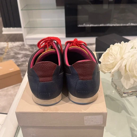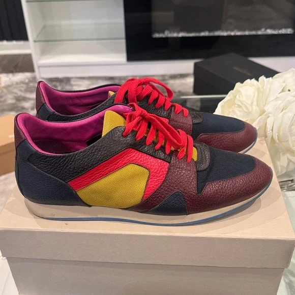 Bold Burberry sneakers with red and yellow accents. Stylish and comfortable for everyday wear.