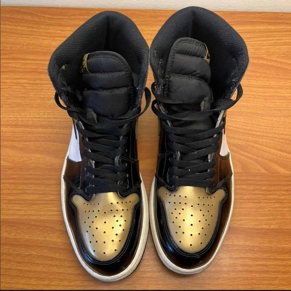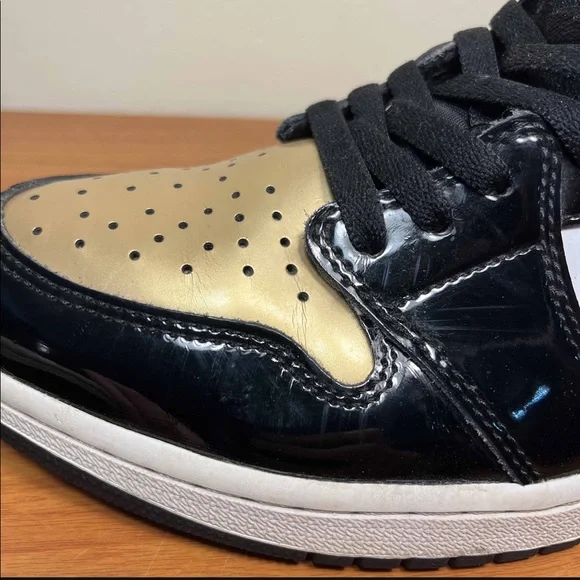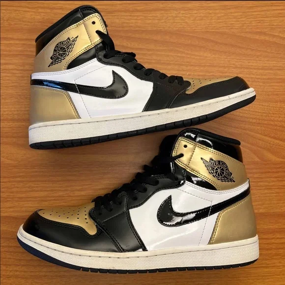 Nike Air Jordan 1 Retro High OG NRG Gold Toe White Black Size 11 Sneakers 861428-007. Used and no box. Scuffs and marks. Drag. Wear in size tag. Replacement insoles. Flaws but still a sick pair of kicks!