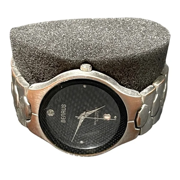 Men’s Wristwatch Vintage BENRUS BNW745 Genuine Diamond Watch Stainless Steel Bracelet Watch Quartz WatchThe case measures 38mm in width excluding the crown.* Rare Collectible * Genuine Diamond Watch* Shock Absorbing Watch* Case back is stainless steel.Good appearance & working condition. Has minor scratches on the the glass and rust & discoloration on the bracelet. Needs a battery replacement. Diamond Watch, Watch, Shock Absorbing Watch, Men`s Dress Watch, Stainless Steel Watch, Quartz Watch, Vintage Watch