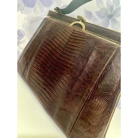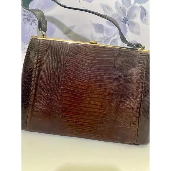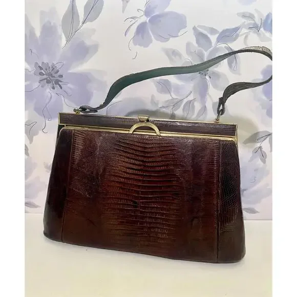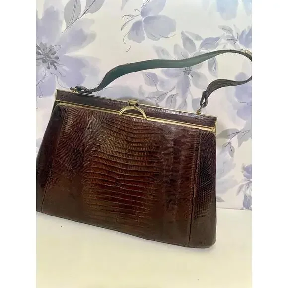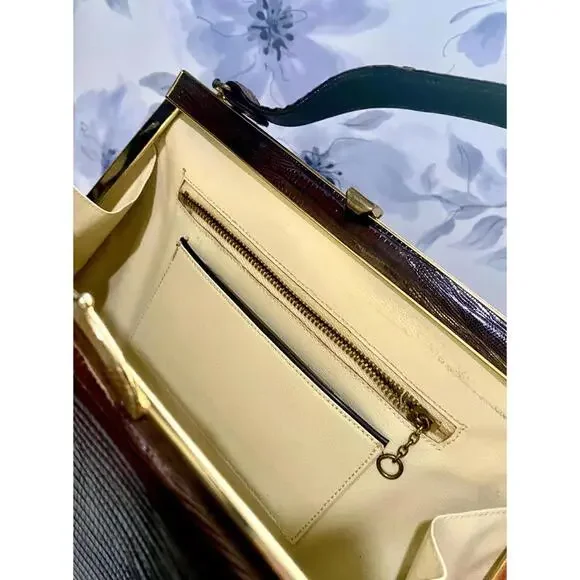 Vintage 50s Brown Alligator Skin Classic Purse Handbag Clutch Gilt Barrel Clasp