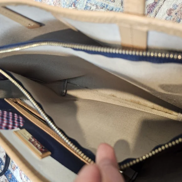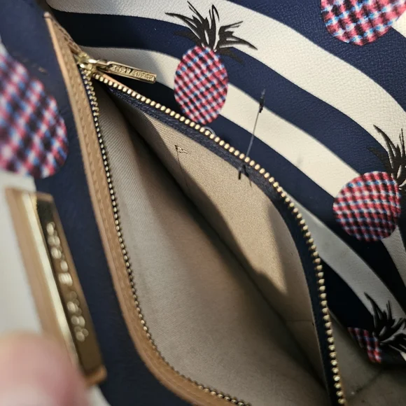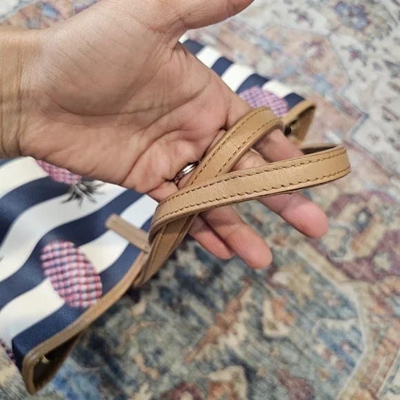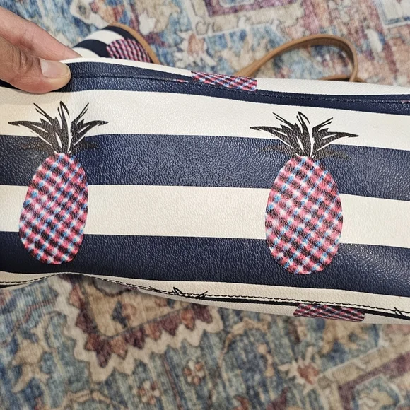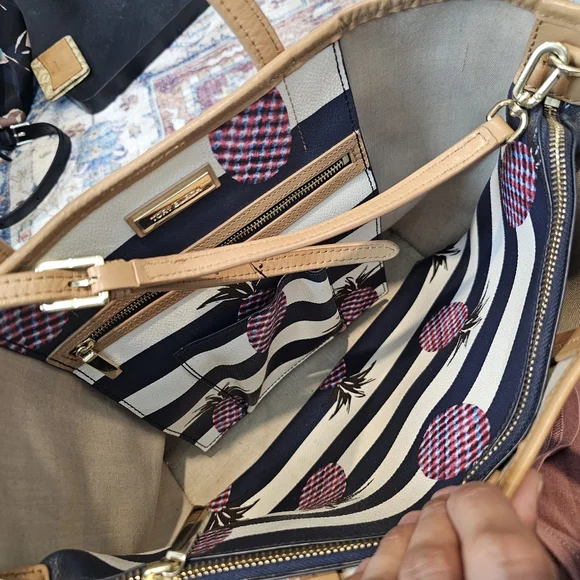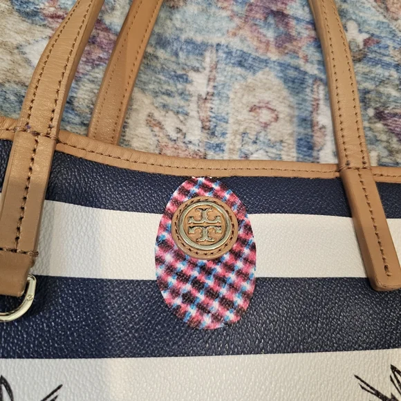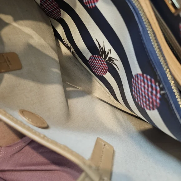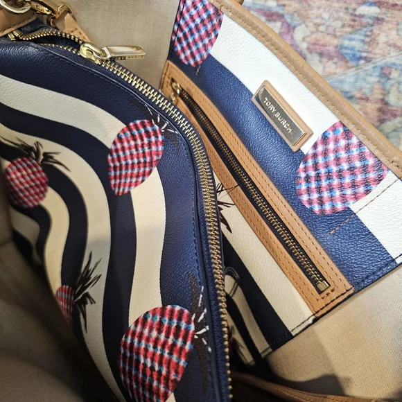 Tory Burch Tote Pineapple Blue and White Crossbody and Tote Bag Blue, Brown & WhiteStripedGold-Tone HardwareHandles & Dual Shoulder StrapsLeather Trim EmbellishmentCanvas Lining &...