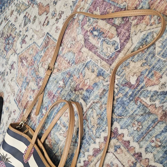 Tory Burch Tote Pineapple Blue and White Crossbody and Tote Bag Blue, Brown & WhiteStripedGold-Tone HardwareHandles & Dual Shoulder StrapsLeather Trim EmbellishmentCanvas Lining & Dual Interior Pockets with Card SlotsOpen TopExcellent preowned condition, no flaws height 10.5"width 15.5"strap 22"