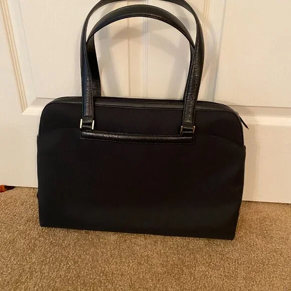 I purchased this bag right before a career change and then never used it once! Nice size, handy outside pockets, lots of organizing pockets inside. Plus it came with a small purse to tuck inside or use on its own.Dimensions:Tote: 17 across 12 high 5 wide at base 9.5 strap dropBaby bag: 8.75 across 5.5 long 1.25 wide at base 5 strap dropMaterials: Nylon/Poly with leather strap and trimEXCELLENT CONDITION and built to last