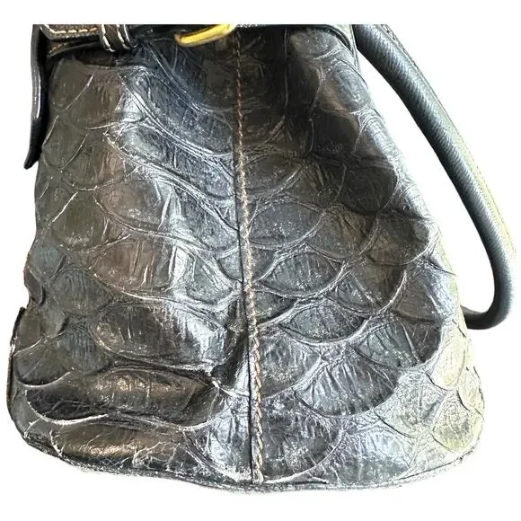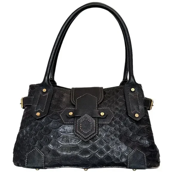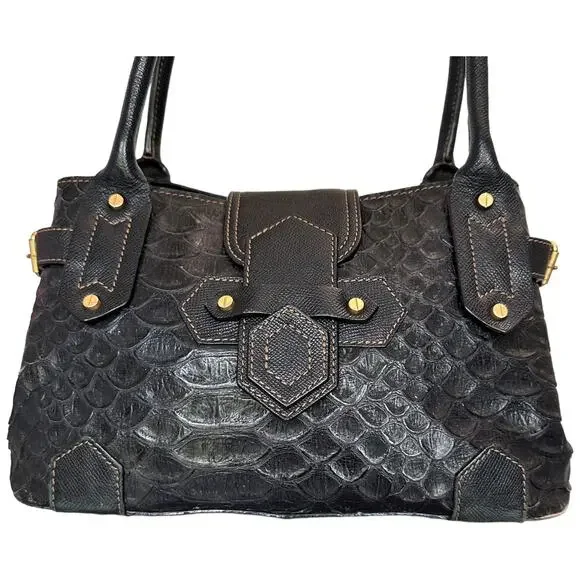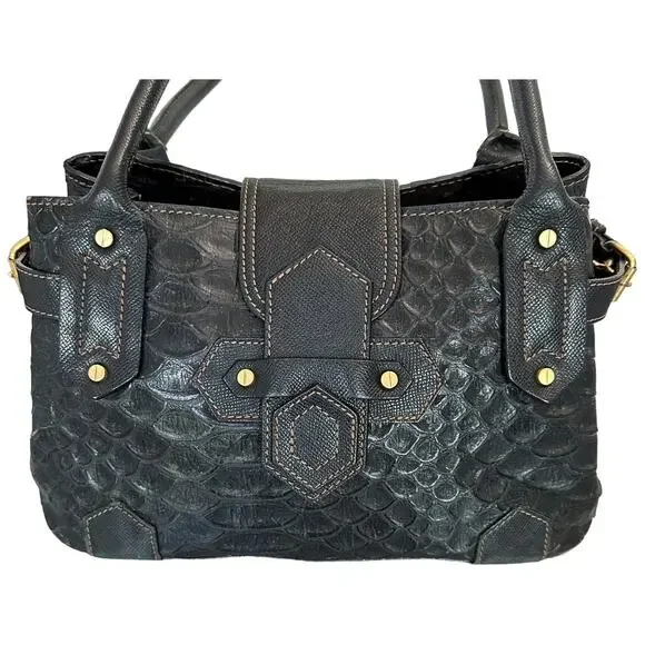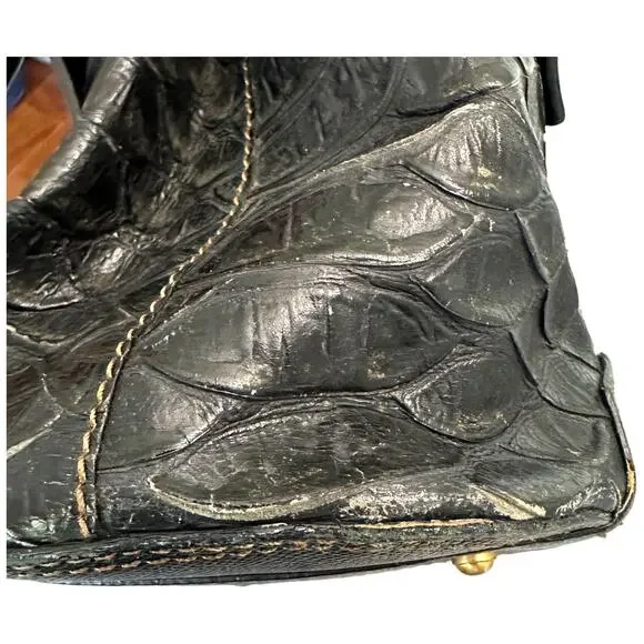 **Details:**- Era: Contemporary- Shape: Satchel- Style: Crocodile Embossed, Sophisticated, Everyday Bag- Color: Black with gold hardware- Size: Medium (Approx. 14" W x 9" H x 5"...