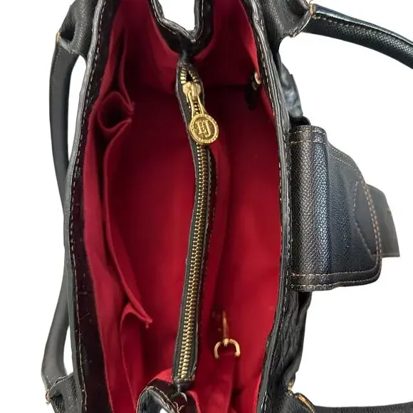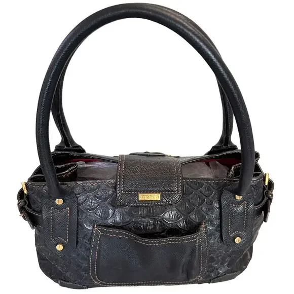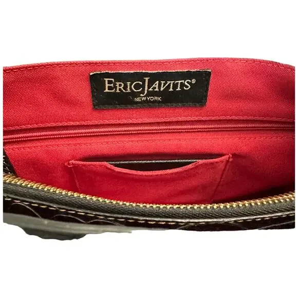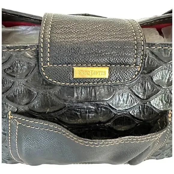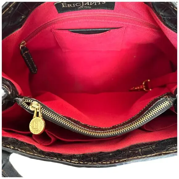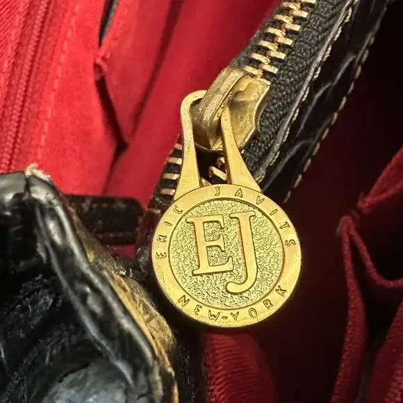 **Details:**- Era: Contemporary- Shape: Satchel- Style: Crocodile Embossed, Sophisticated, Everyday Bag- Color: Black with gold hardware- Size: Medium (Approx. 14" W x 9" H x 5" D)- Fabric: Crocodile-embossed leather exterior, red fabric-lined interior**Measurements:**- Width: Approx. 14"- Height: Approx. 9"- Depth: Approx. 5"- Handle Drop: Approx. 8"**Additional Features:**This Eric Javits croc-embossed leather satchel features gold-tone hardware, a magnetic top closure, and protective feet on the bottom. The interior has multiple compartments with a red fabric lining. Pre-loved, with minor scuffs on the edges and light scratches on the leather.Please look at all pictures for condition of bag.