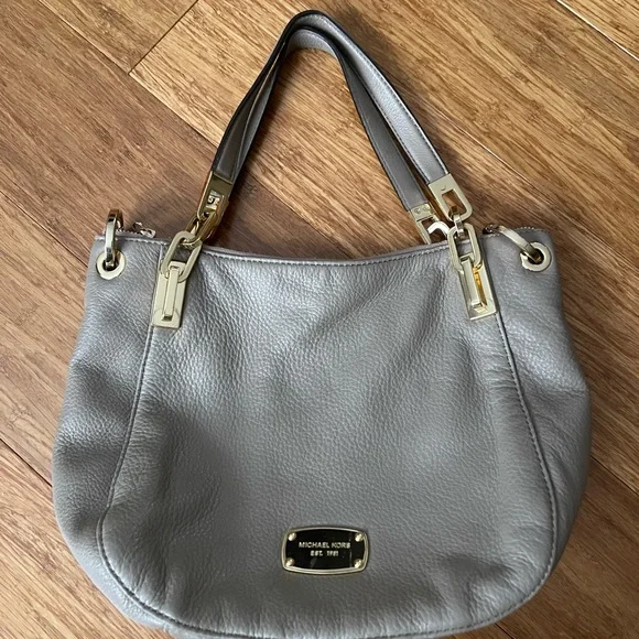 Michael Kors Pebble Taupe Leather Purse with Gold DetailsCrossbody bag with the option to remove the additional strap and style it as a handbag or shoulder bag. Love all the options! This bag color is gorgeous and the pebble leather is so so soft! I would call the leather color taupe, but I’m not sure if the actual name. Features a gold nameplate, gold chains to connect the handles, and gold zipper. Purse is 9 inches long at the top and 10 inches long at the bottom; 4 inches wide, and 9.5 inches tall. Excellent condition! Very few signs of any wear. One of my favorite bags but I have to make room in my closet. Ships quickly from a clean and smoke free home.