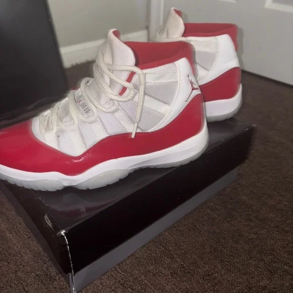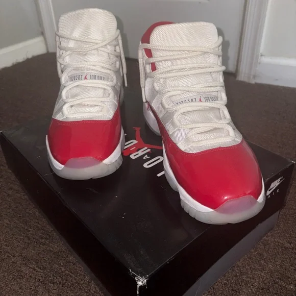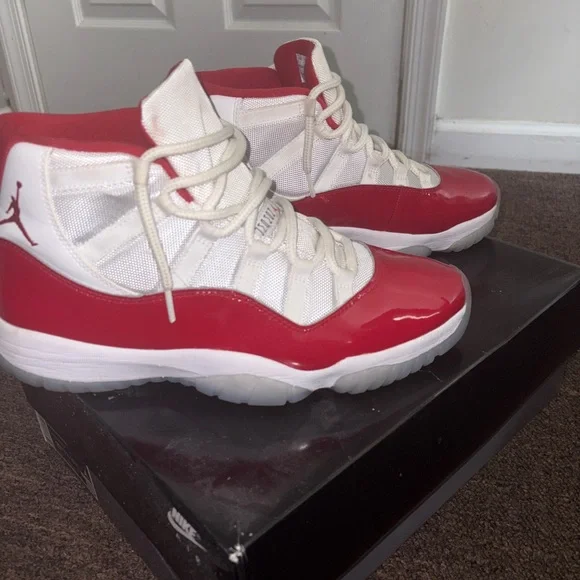 These Jordan sneakers showcase a striking red and white colorway, featuring a sleek white leather upper with glossy red patent leather overlays. The signature rope-style lacing and semi-translucent outsole add to the iconic look, making them a standout choice for sneaker enthusiasts.