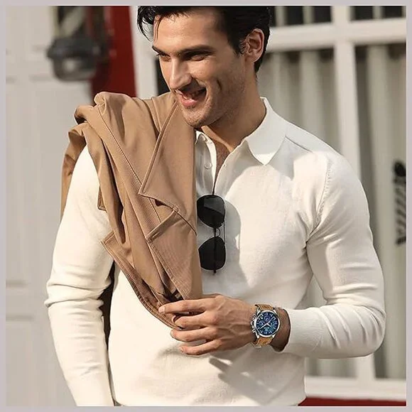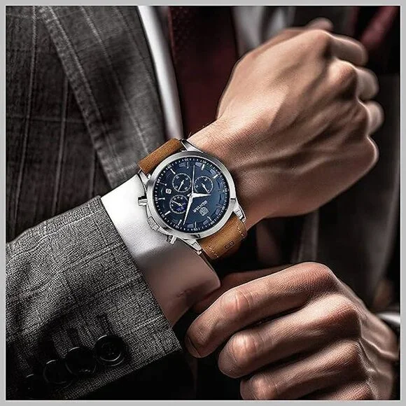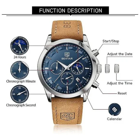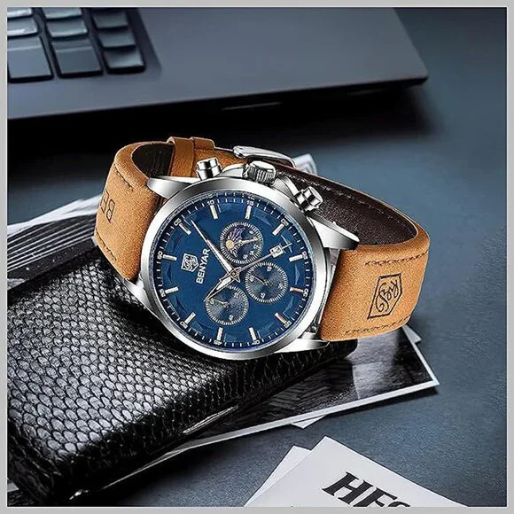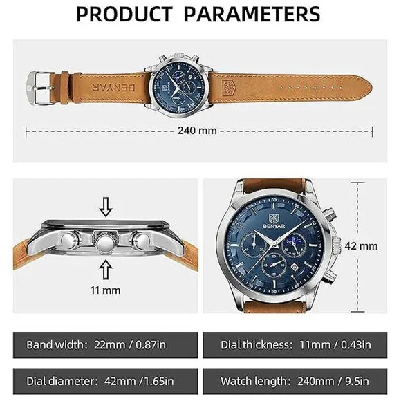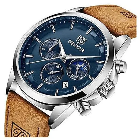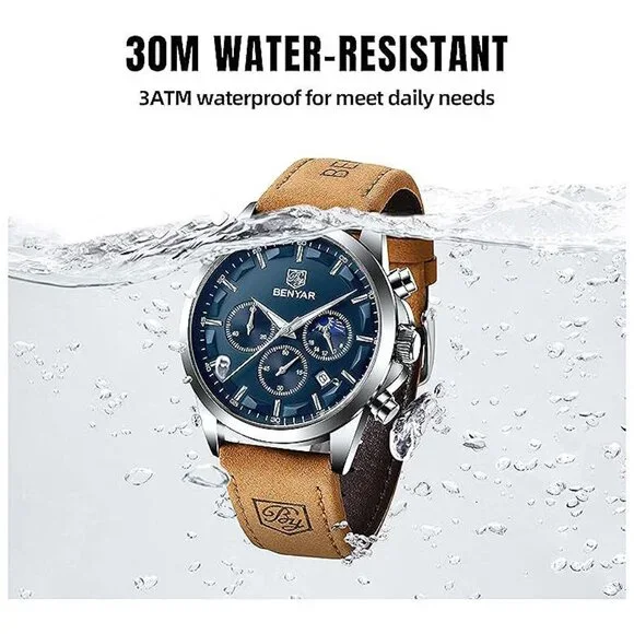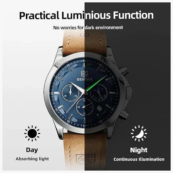 * ACCURATE TIME KEEPING: BENYAR watches men use the original imported branded movement to provide stable and accurate travel time for the watch, it will always tell you accurate time in any occasions or important moments. Built-in high-quality BATTERY, the service life is as long as 2-3 years. Classic big face mens watches, fashion hands/markers, calendar window and three chronograph subdials, provide more functions and allow you to easily grasp the rhythm of time. * COMFORTABLE AND DURABLE: When you need a quality analog quartz watch men to prove that you value your time and enhance your taste. BENYAR brown leather band watch for men not only makes a comfortable sense for your wrist but also easy to match your outfit. Our men´s wrist watches are suit for both the adventurer and the everyday man looking for a stylish style. Our passion drives us towards perfection, putting in hours of work to get a truly amazing and unique end product. * WATERPROOF LUMINOUS CHRONOGRAPH: 3ATM Waterproof, BENYAR´s waterproof watches for men can meet daily waterproof needs, bear sweat, accidental rain or water splash, but Not suitable for bathing, swimming, diving. After absorbing enough light energy, you can check the time of the watch in a dark environment. Multi-Function chronograph watch for men with three sub-dials for second, minute and hour that can be used as timers. It is a multifunctional brown leather strap wrist watches for man.