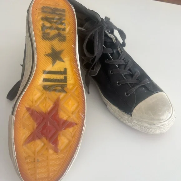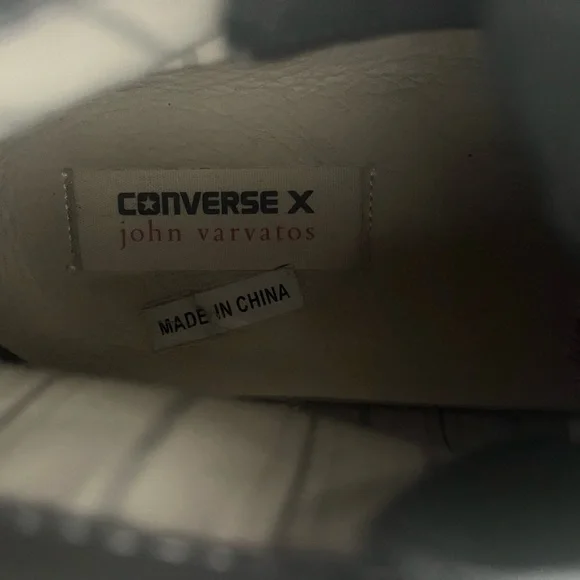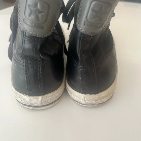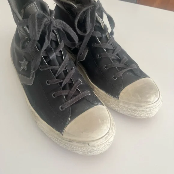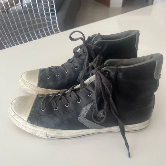 Stylish high-top sneakers. Black leather with white toe caps. Lace-up design.
