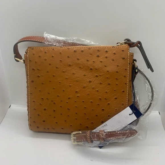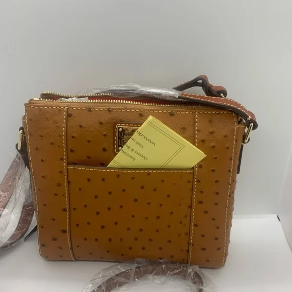 Tan Lexington crossbody with one exterior pocket, two interior pockets and one interior zipper pocket. Registration card included