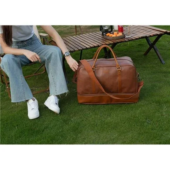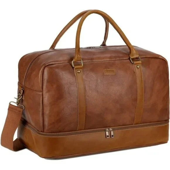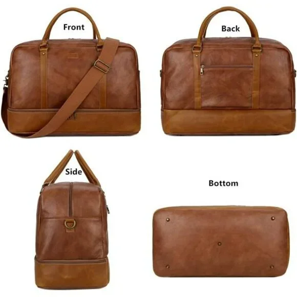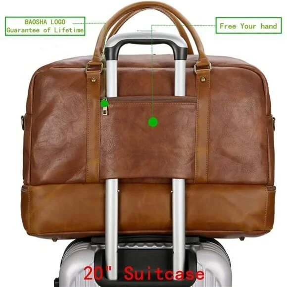 -Material: Full soft Faux Leather-Vintage Brown leather accents-But Maybe a Little Heavy for women(2.8Pounds)-Size: 50cm*32cm*25cm(L*H*D)/20´´*12.6´´*10´´(L*H*D). perfect for a weekend or 4~5 days One person trip-With Shoe Compartement: large, flat separate compartment that can accommodates shoes, toiletry bag or other items you want to keep separate-Carry-on: A carry on bag for flying that doubles as a gym, overnighter or weekender bag-Trolley Sleeve: Our special trolley sleeve is designed to make air travel even easier with a uniquely fashioned sleeve to slip over the handle of your rolling luggage