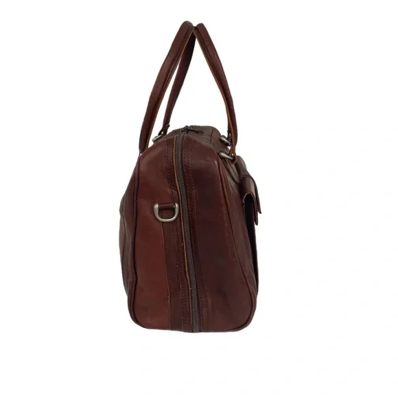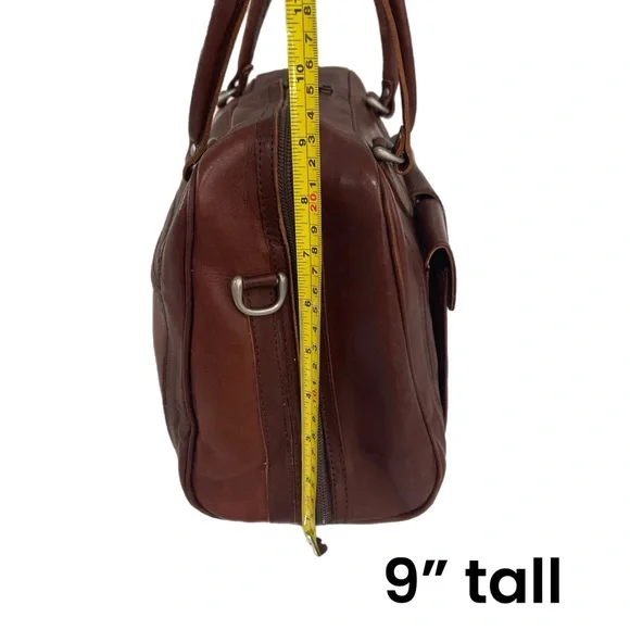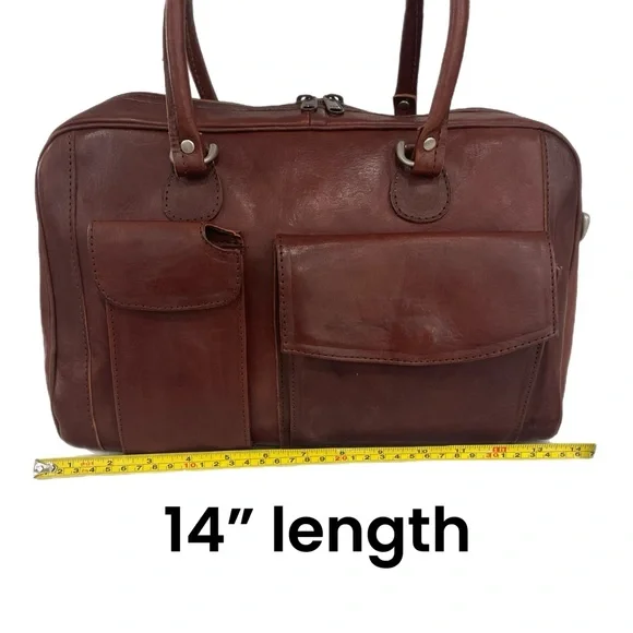 14” length 6” deep- closed 9” tall8” handle drop High quality, handmade,waxed leather bag.Very good pre-owned condition.Unisex, travel bag, career case.