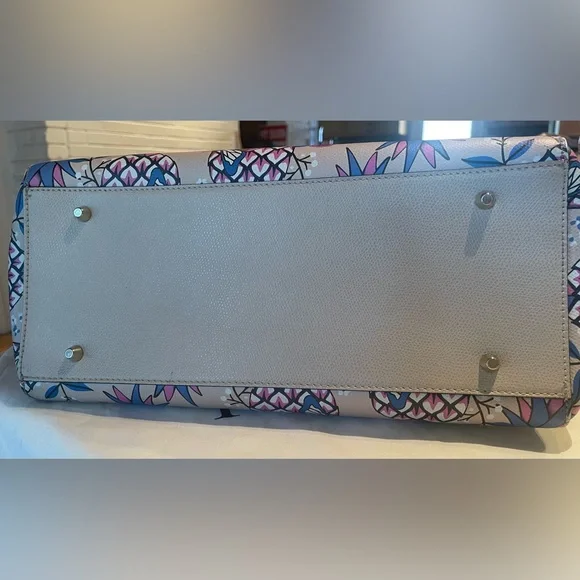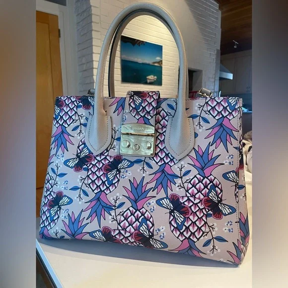 Furla Italian top handle bag with removable strap. Base color is light beige with pineapples and butterflies in hot pink and electric blue. Genuine leather. In excellent condition and only used a few times. Length is 12” and width 9”. Base is 5”. There’s one large interior zipped pocket and two additional pockets for cell phone and other.