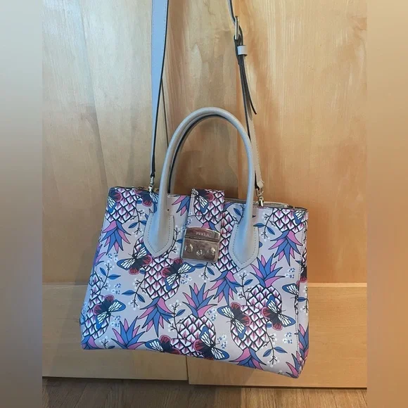 Furla Italian top handle bag with removable strap. Base color is light beige with pineapples and butterflies in hot pink and electric blue. Genuine leather. In excellent condition...