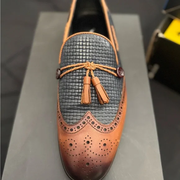 Stylish loafers with woven texture. Brown and gray design. Tassel accent for added flair.