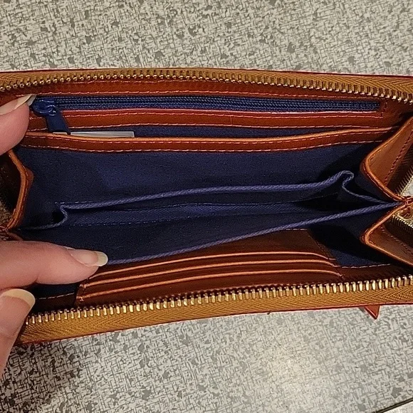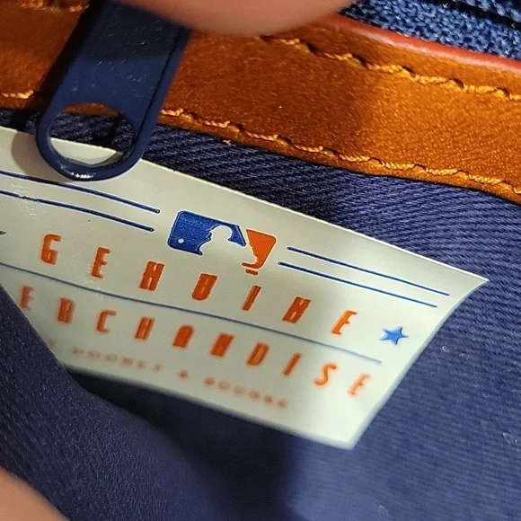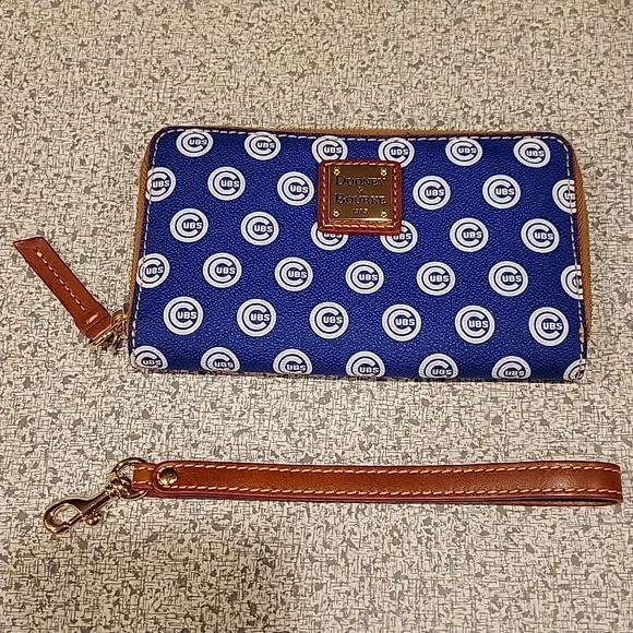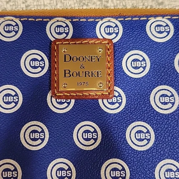 *gently pre-loved, wonderful condition*blue with white Chicago Cubs logo, blue fabric interior, brown leather trim, detachable wrist strap*interior organization, card slots, zip compartment*typical Dooney &Bourke quality hardware and zipper*not made to carry large phones*official MLB product