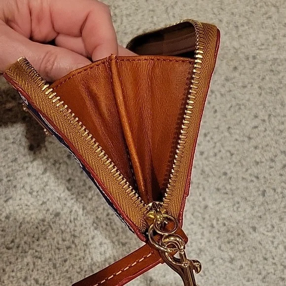 *gently pre-loved, wonderful condition*blue with white Chicago Cubs logo, blue fabric interior, brown leather trim, detachable wrist strap*interior organization, card slots, zip...