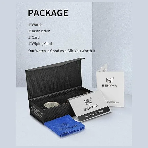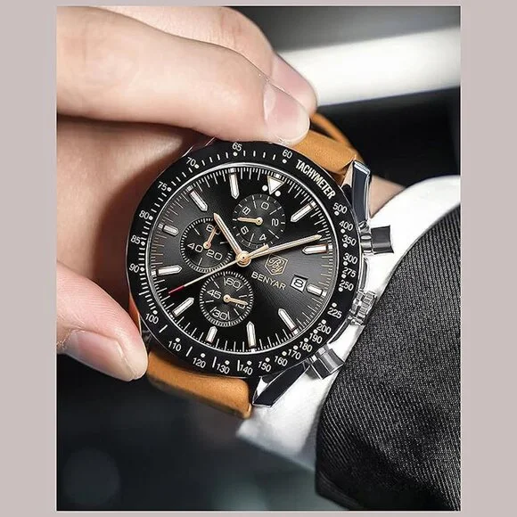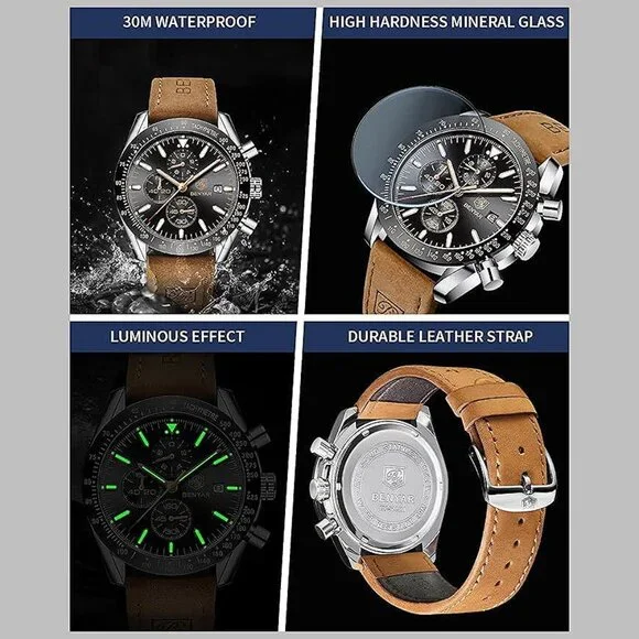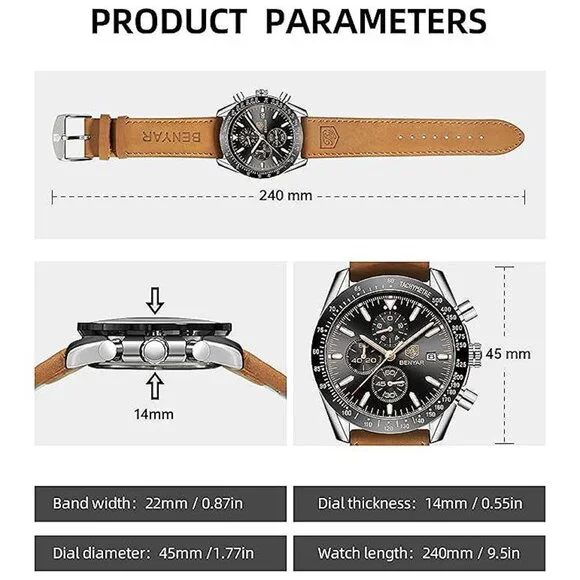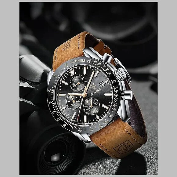* ⌚【UNIQUE ELEGANT DESIGN】This is a stylish and classic design man watch. 45MM beautiful and exquisite big face with three functional subdials and date display, tachymeter numerals on the bezel, with a fashion brown leather strap, Quality quartz analog movement and battery, provide precise time and perfectly match any of your outfits, Benyar analog wrist watch embodies the pursuit of fashion and quality that redefines time! * ⌚【QUALITY & COMFORTABLE】high quality imported quartz movement to provide high stability and accurate timing. 304 steel case with mineral glass, which greatly improves the wear resistance and scratch resistance. The brown leather strap watch for men not only looks elegant and stylish, but is also comfortable and soft to wear. This men´s wrist watches will stand the test of style and last a lifetime if properly maintained. * ⌚【CHRONOGRAPH & WATERPROOF】Multifunctional sub-dial can be used as timers (Second, Minute and Hour Chronographs). BENYAR´s waterproof chronograph watches for men is waterproof 30M/3ATM, can withstand sweat, accidental rain or water splash (Showering, swimming, immersion in water is not recommended). After absorbing enough light energy to have a certain glow-in-the-dark effect in dark environments. It is a multifunctional leather watches for men. * ⌚【EXQUISITE PRESENT】Fashion and casual watches suitable for men and youth, perfect for everyday wear and any occasion, providing accurate timekeeping and becoming a fashion statement for