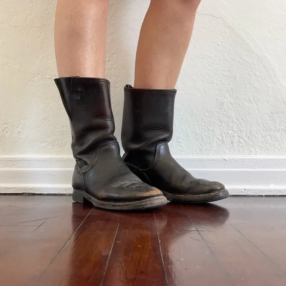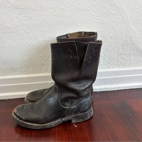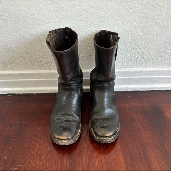 Vintage Frye boots I think! No tag but they feel and look like them. Super sturdy and durable Women’s 8-8.5 I’m a 9 and they’re a lil snug but I make em work I’m so...
