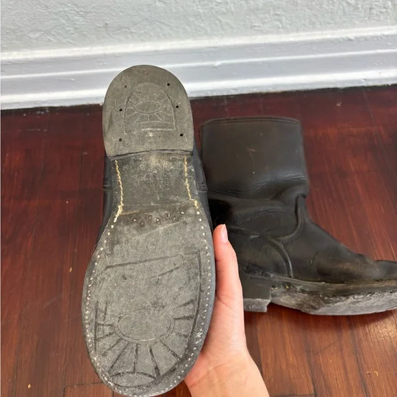 Vintage Frye boots I think! No tag but they feel and look like them. Super sturdy and durable Women’s 8-8.5 I’m a 9 and they’re a lil snug but I make em work I’m so obsessed w them Black leather biker motorcycle boots