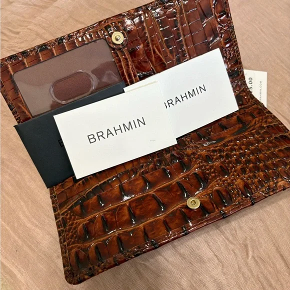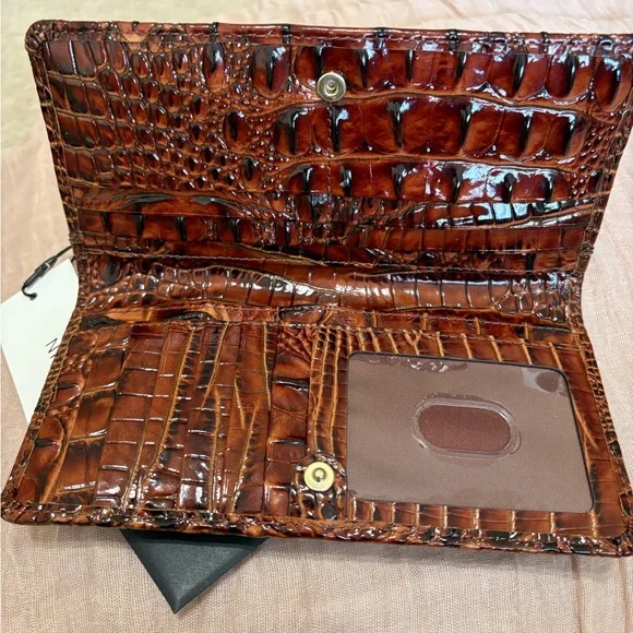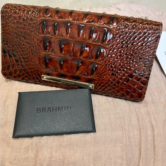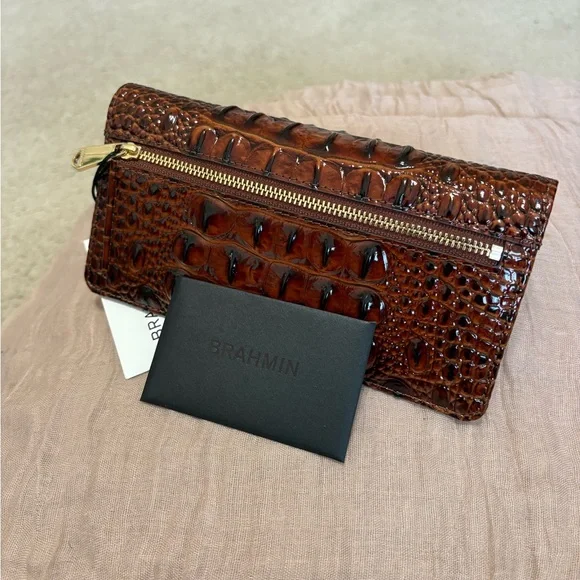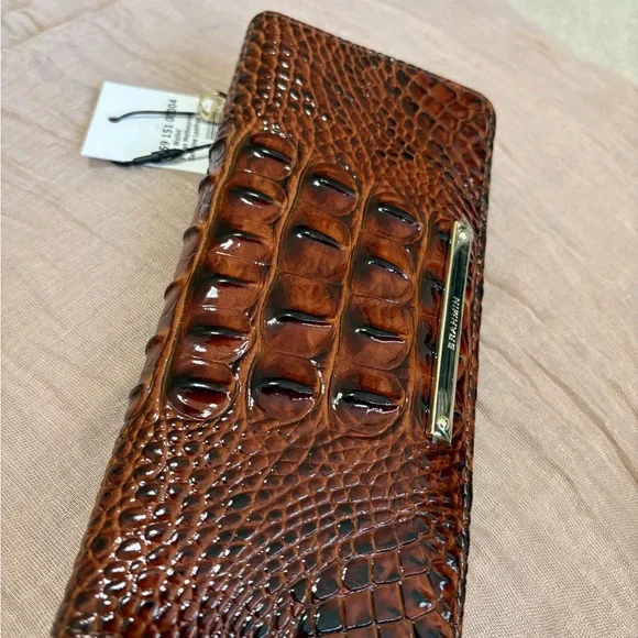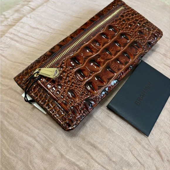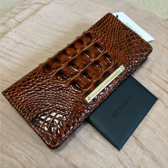 Stylish Brahmin Pecan Melbourne wallet with crocodile texture. Features a warm tan hue and sleek design.