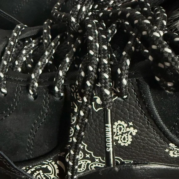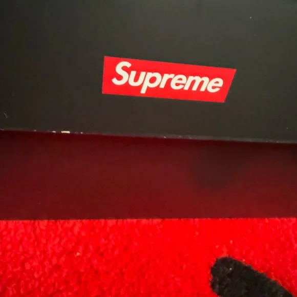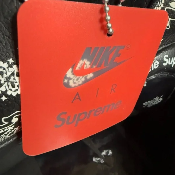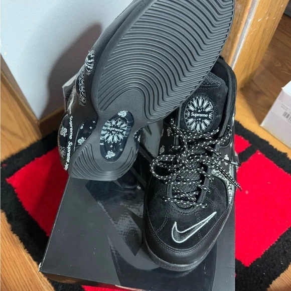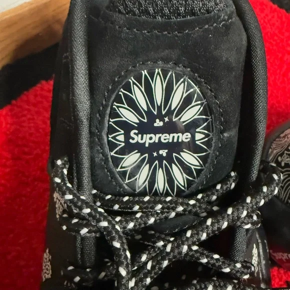 Stylish Supreme x Nike sneakers. Black with white paisley patterns. Perfect for casual wear. Brand new with box, size 8.5M