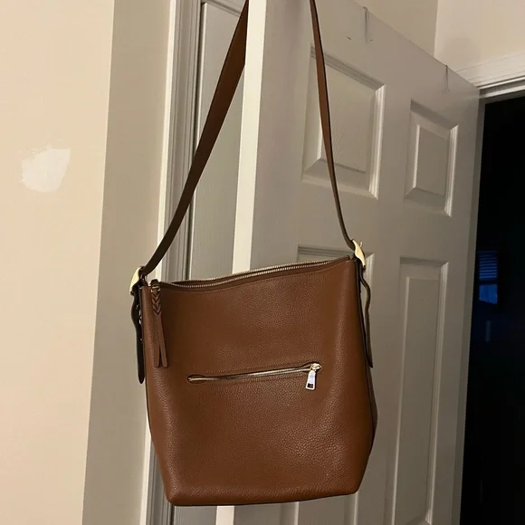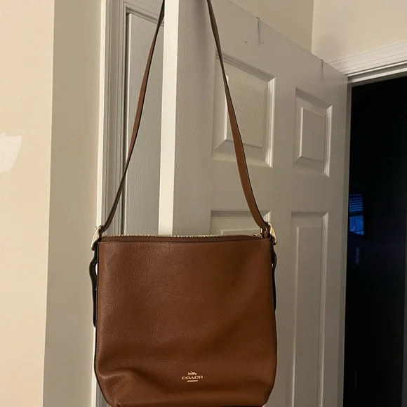 Elegant brown leather bag by Coach. Features gold-tone hardware. Spacious interior with zipper closure.Brand new, only used once.