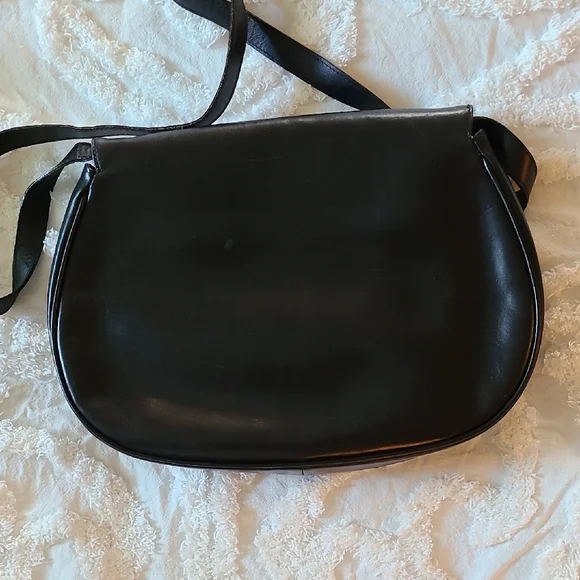 This black leather shoulder bag boasts a classic design with a smooth, polished finish. Its medium size and structured form make it a versatile and classic accessory for any...