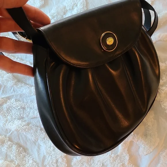 This black leather shoulder bag boasts a classic design with a smooth, polished finish. Its medium size and structured form make it a versatile and classic accessory for any occasion.