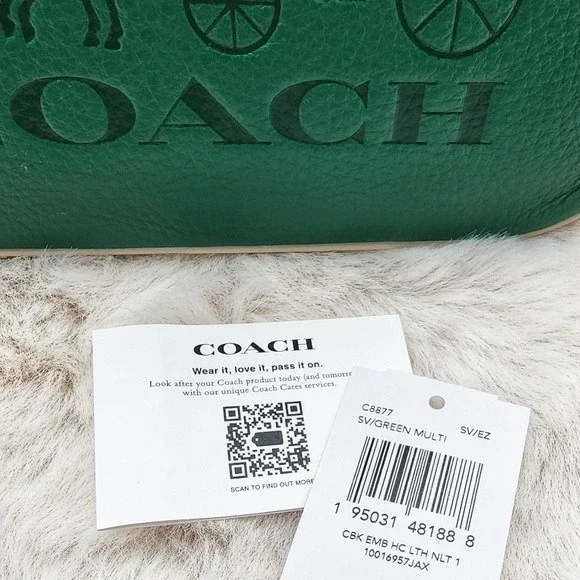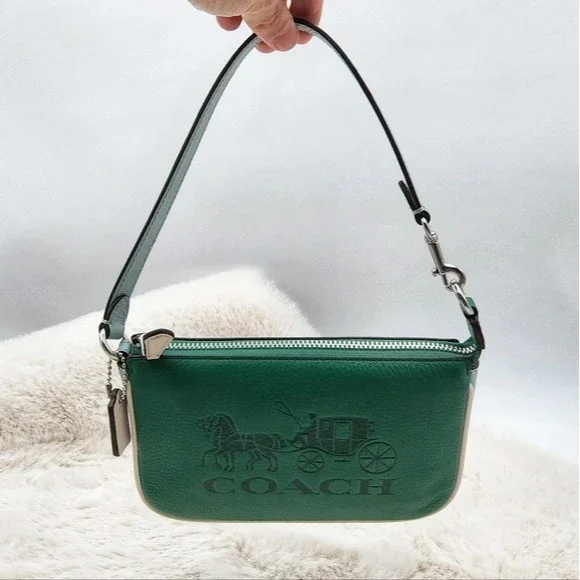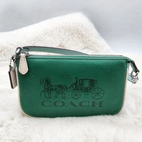 NEW WITH TAGS Brand: COACH Nolita 19 In Colorblock With Horse And Carriage. Style No. C8877Color: Green, white, & light blue exterior with silver hardware. Brown interior.Features: Refined pebble leather, two credit card slots, inside multifunction pocketZip-top closure, fabric liningSize: Handle with 6 1/4" drop7 1/2" (L) x 4 1/2" (H) x 2" (W)price NEW is $188#006