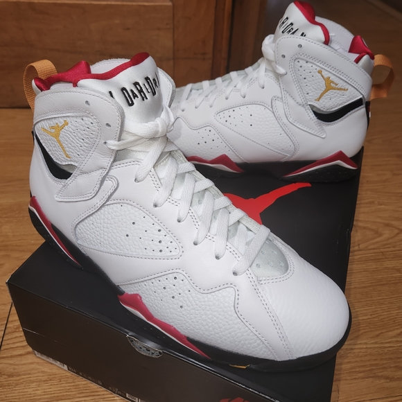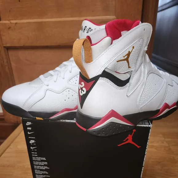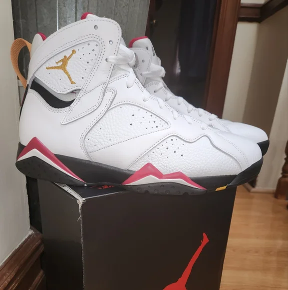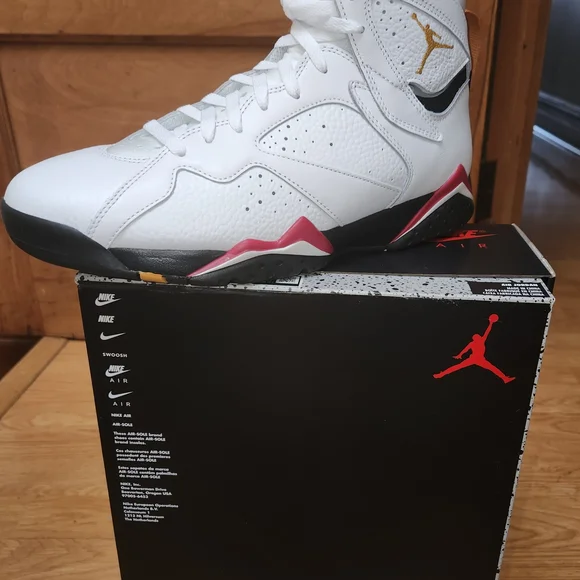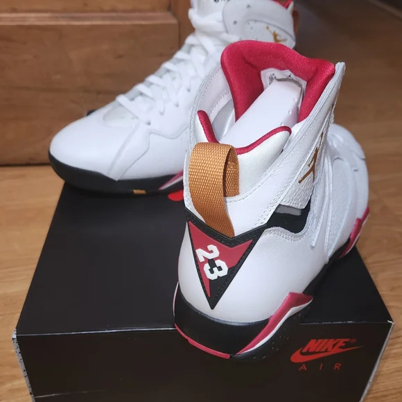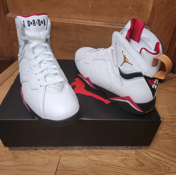 White sneakers with red accents and a gold logo. Stylish and iconic design.