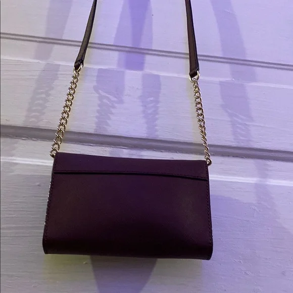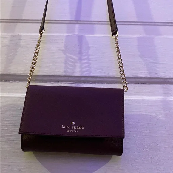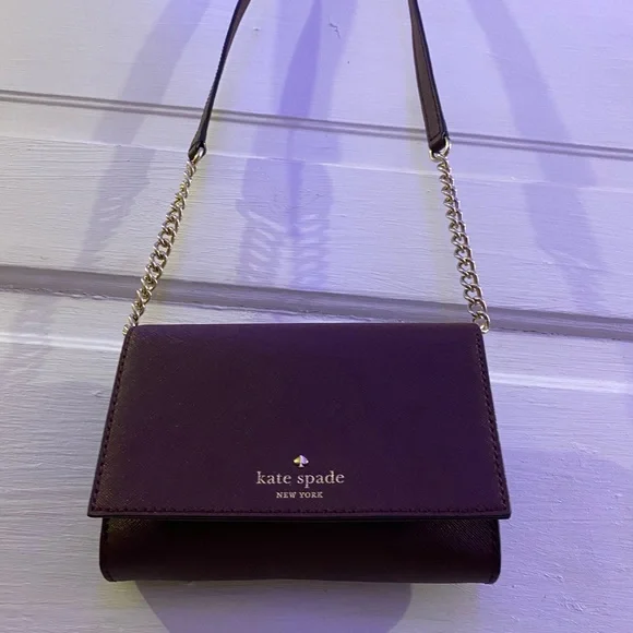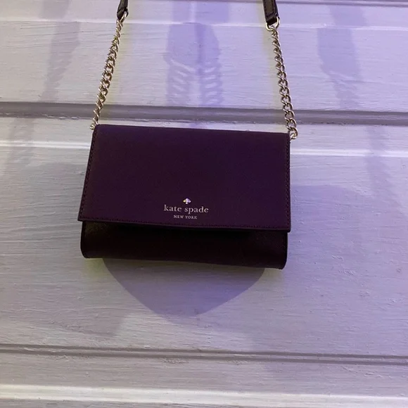 This elegant Kate Spade crossbody bag showcases a deep purple hue, enhanced by a structured design and gold-tone chain accents. Its minimalist aesthetic and smooth leather finish make it a timeless accessory for any occasion. They are in good condition they have no flaws.
