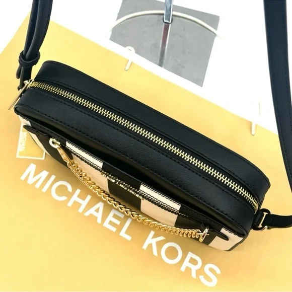 Brand New with Tag 100% authentic !Make an offer !NWT Michael Kors large Jet Set Item EW messengerBlack Multi colorMK signature PVC coated canvas and genuine Saffiano leather with gold-tone hardwareZippered top ClosureMichael Kors Lettering Logo on FrontInside: 1 large padded pocket, & 1 slip pockets MK Signature fabric lining 10"(L) × 6.5"(H) x 2"(D) adjustable 22" chains & leather crossbody strap This is an outlet style