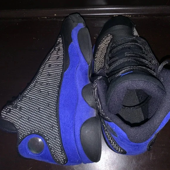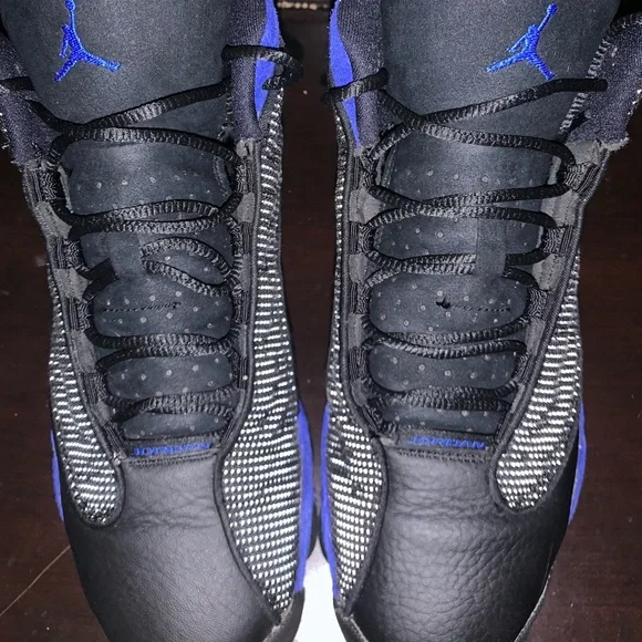 The Air Jordan 13 Retro ‘Black Royal’ features a two-tone design reminiscent of Quentin Richardson’s Orlando Magic PE from 2012. The upper combines black tumbled leather, royal blue suede and reflective mesh overlays. Branding elements include the signature holographic eye and a blue Jumpman logo embroidered atop the tongue. The distinctive cat’s paw outsole is equipped with herringbone rubber for grippy traction underfoot. These Nike sneakers feature a high-top design with a predominantly black upper made from textured material. The vibrant royal blue accents on the midsole and tongue add a striking contrast, making them perfect for both performance and style. Preowned condition well kept! No rips holes or tears feel free to ask any questions