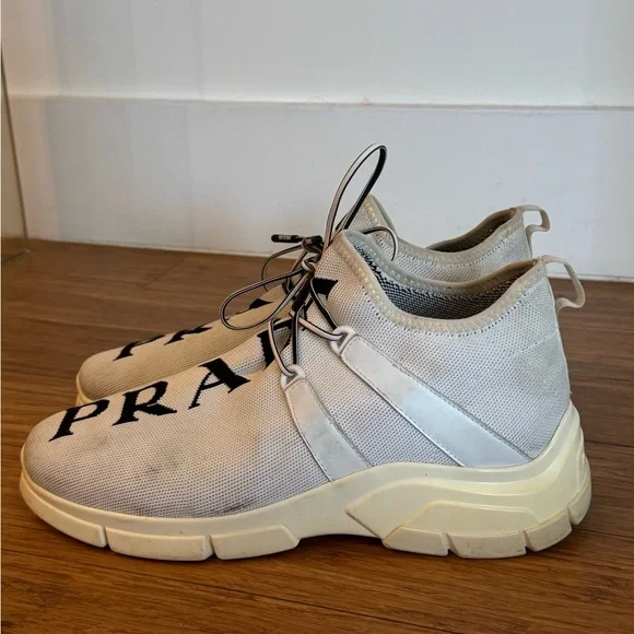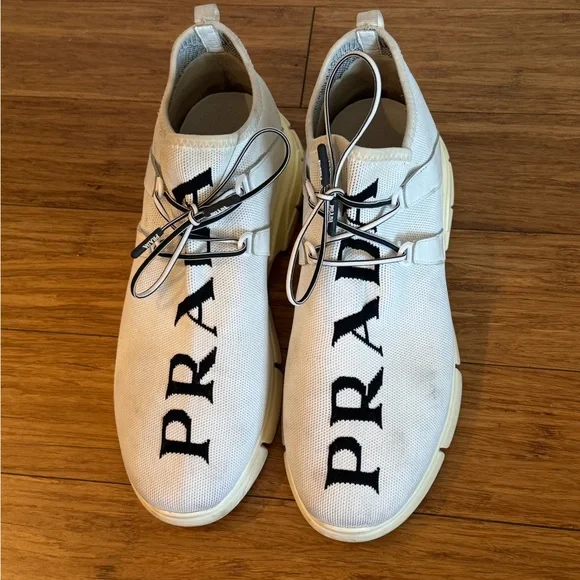 Authentic prada logo flexible sneaker. Perfect for athletic use, athleisure wear to elevate any look. Shows mild wear.