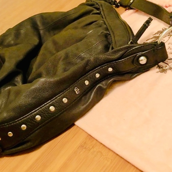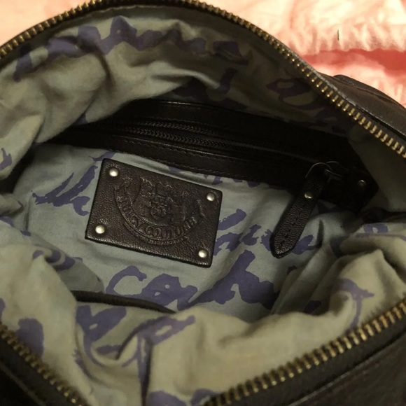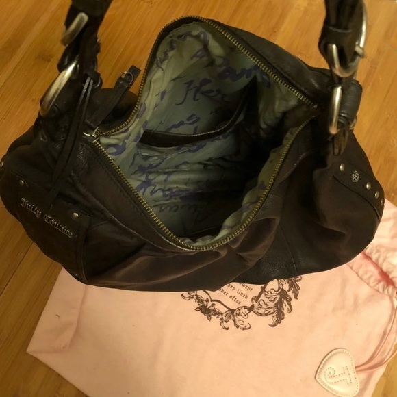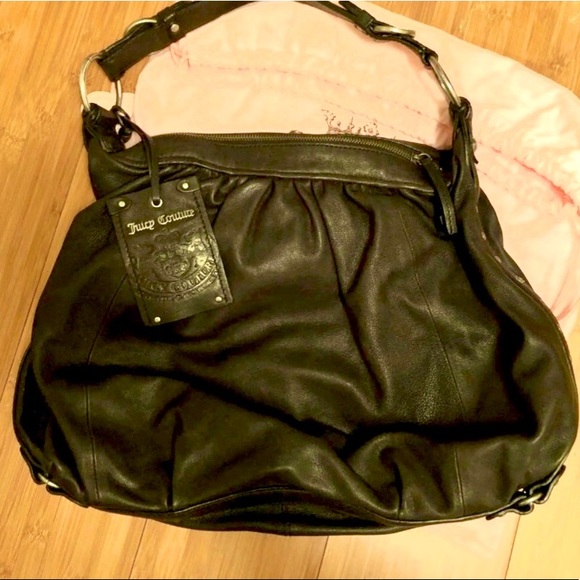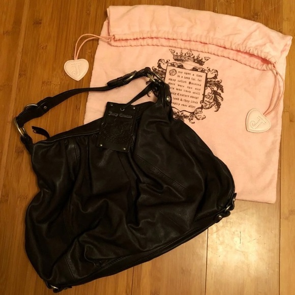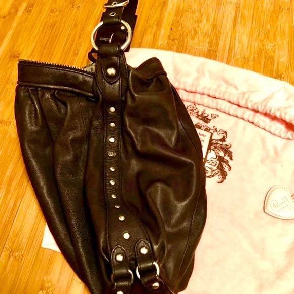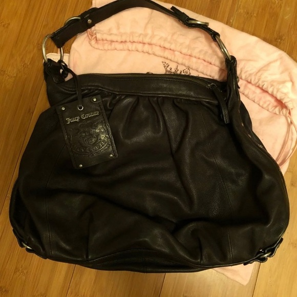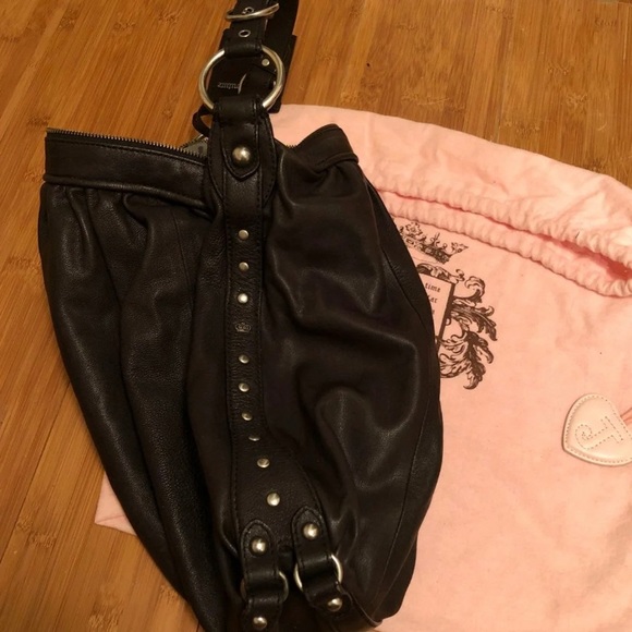 Juicy Couture Leather VINTAGE HIGH QUALITY SOFT LEATHER HandbagColor: BlackHardware: Silver Condition: Like New- Used 2-5x! STILL BRAND NEWRetail: $450+INCLUDES PINK JUICY COUTURE DUSTBAG***NOTE: THIS is from the original LUXURY Juicy Couture line- IT IS NOT THE SAME AS WHAT IS BEING SOLD AT KOHL’s CURRENTLY. This was purchased at The Juicy Couture store in Newbury Street in Boston, MA - when the brand was sold exclusively at Nordstrom & other high end retailers & it was before the brand was sold to “Brand Ambassadors” THIS IS RARE | VINTAGE | H2F & HIGHLY SOUGHT AFTER !!!Juicy Couture soft black leather hobo style handbag, in med/large! This handbag zippers close to shut so all of your products stay in their place. This bag is the perfect size for everything you carry on a typical day- Wallet, keys, cell phone & you can also fit a few others! •Left & right side have silver studs - one side has a gorgeous crown emblem. •Silver hardware throughout. •Interior has a large zipper pocket on one side•Interior has 2 small slip pockets on opposite side•Inside has Juicy couture lining. •Top of bag zippers shut to close. •Juicy Couture “luggage tag” black embossed leather w/their emblem & name. Beautiful like new vintage leather handbag- purchased at their store, was recently reduced to $395 retail was over $495! VINTAGE | SOFT LEATHER | CROWN EMBELLISHMENTS | Includes JC Dustbag