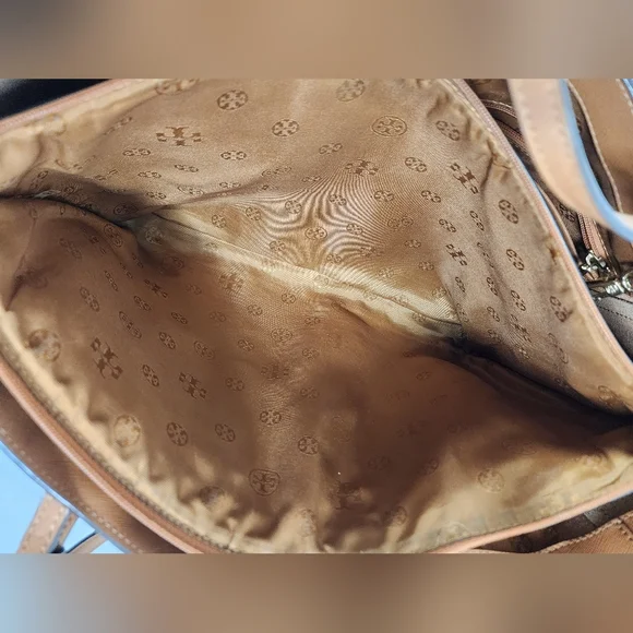 Tory Burch Emerson Canvas Leather Tote BagColor: Caramel Brown Size: LargeMeasurements:Please see photos above for all measurements BAG IS IN VERY GOOD USED CONDITIONa little...