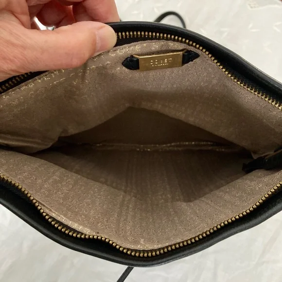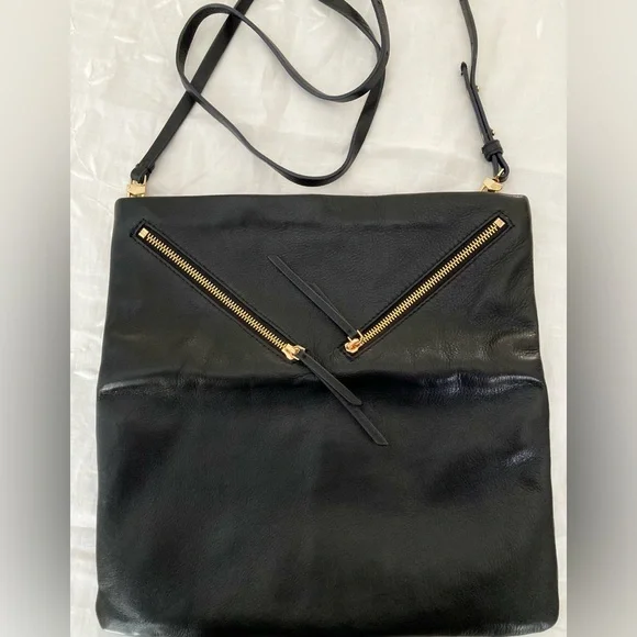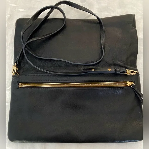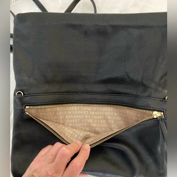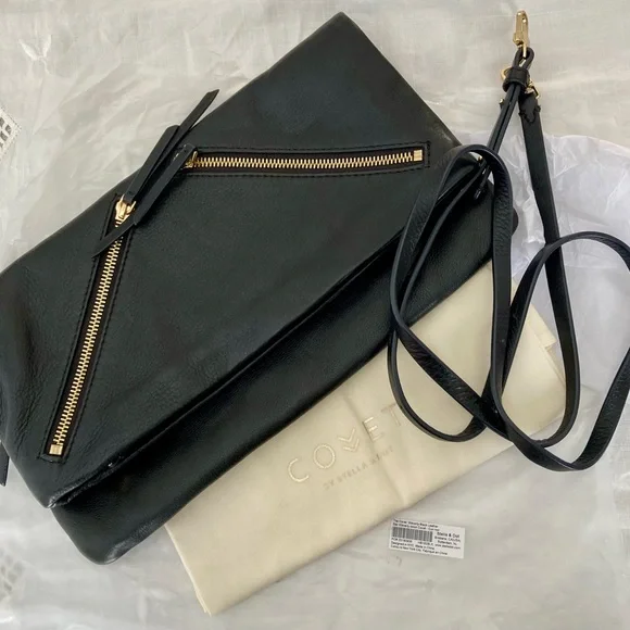 Beautiful black leather bag is versatile and features a 100% buttery soft leather exterior with shiny gold plate zippers/hardware, the signature COVET lining and a removable and adjustable strap!Bag has 3 exterior zip pockets and zip closure and in like new condition!When used as a clutch (without the strap) or as a foldover crossbody, bag measures 12" wide x 6 1/2" high x 1 3/4" deep.As a full sized crossbody bag, it measures 12" wide x 11 3/4" high x 1" wide!The bag comes with it´s original soft storage protective pouch and original shipping pouch!