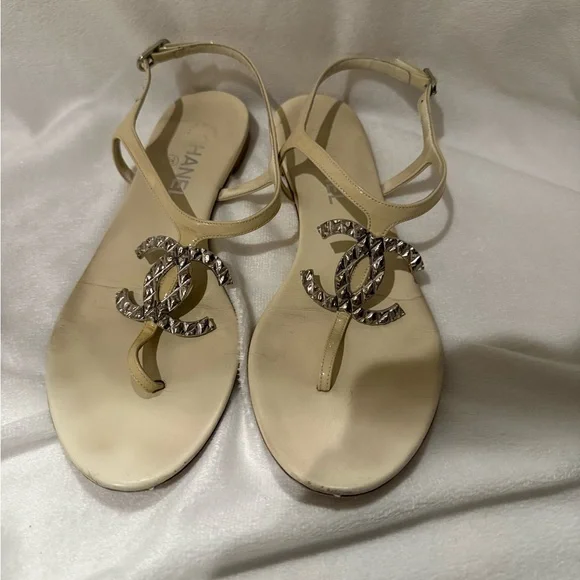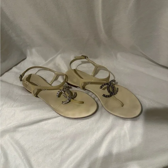 Authentic Sandals. In used condition as pictured. But, in good condition overall. Silver CC on front. Patent leather straps and lambskin leather foot bed. Leather soles. No box or...