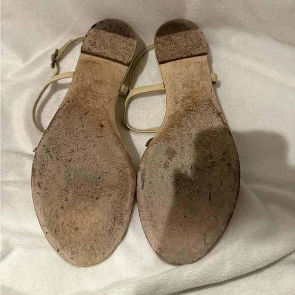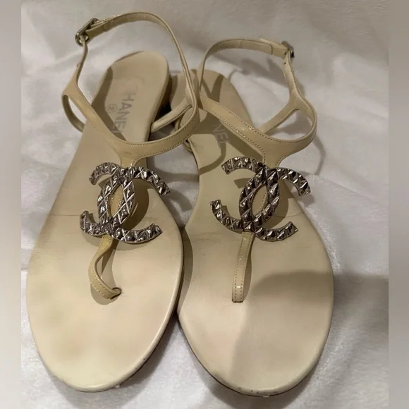 Authentic Sandals. In used condition as pictured. But, in good condition overall. Silver CC on front. Patent leather straps and lambskin leather foot bed. Leather soles. No box or dust bag. Euro 39.5From the Spring/Summer 2010 collection. As seen on Kendall Jenner!