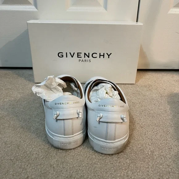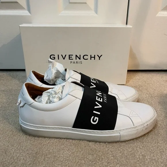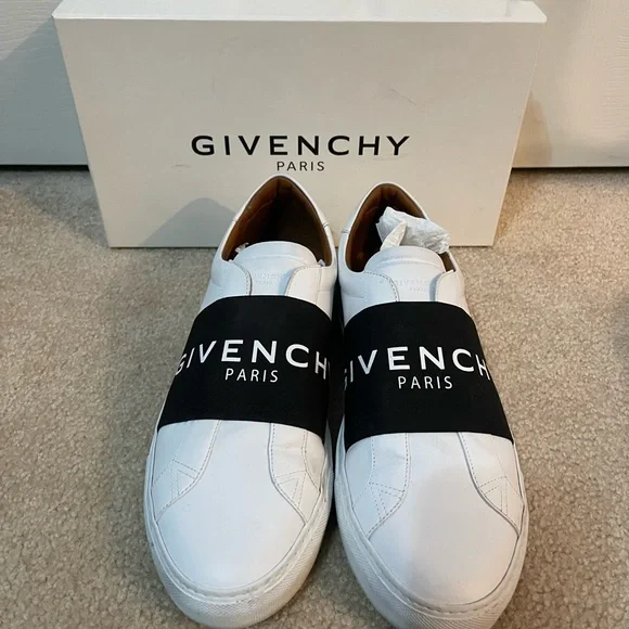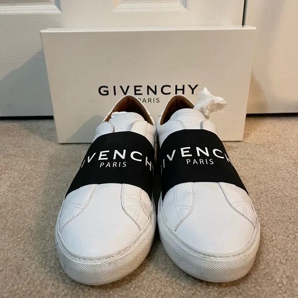 Stylish Givenchy sneakers. White leather with black strap. Comfortable and sleek design.