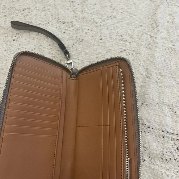 Elegant Tory Burch wallet with wrist strap. Features a sleek taupe design.