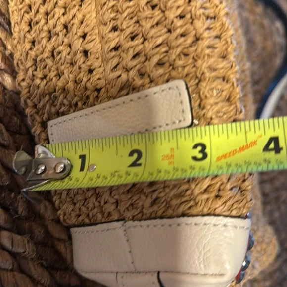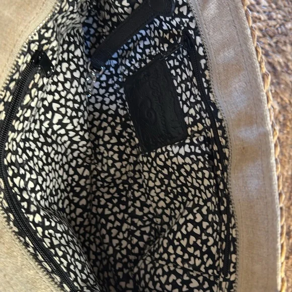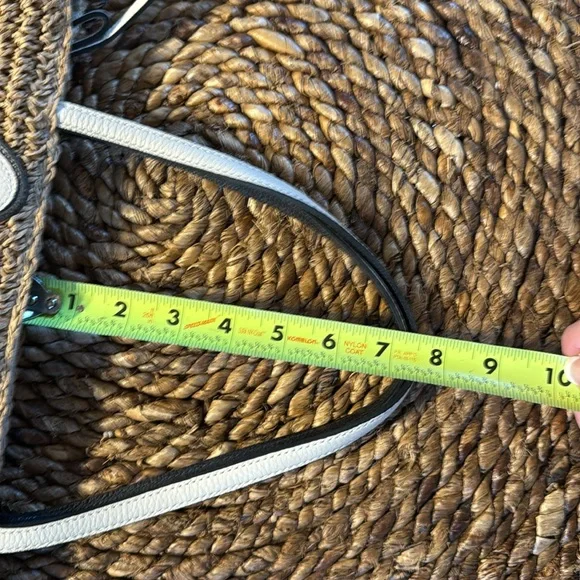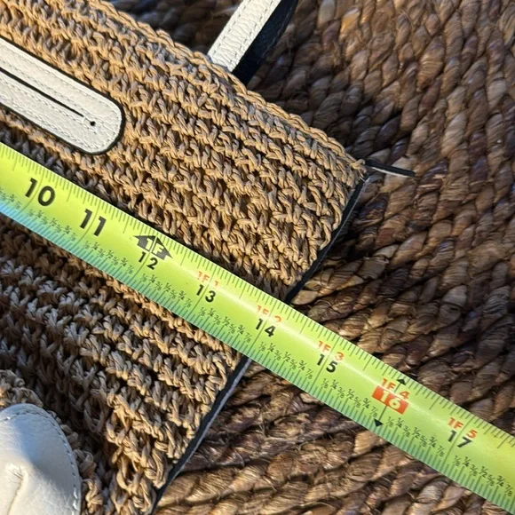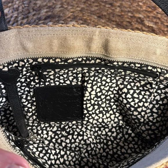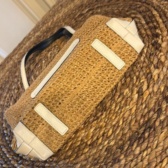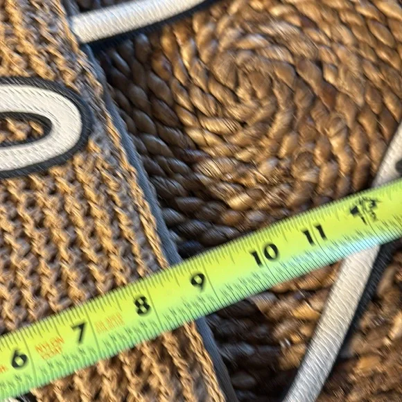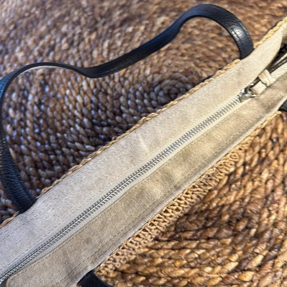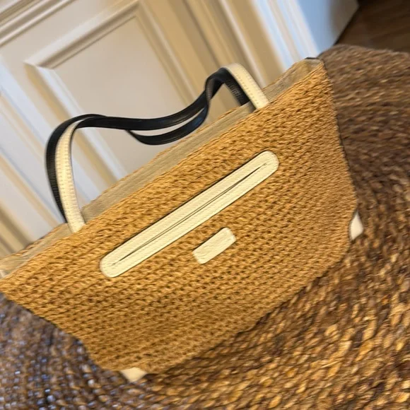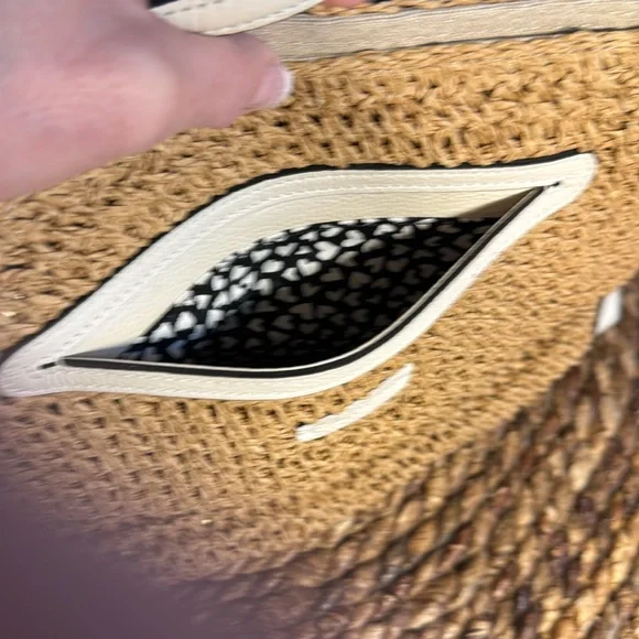 Never used beautiful Love Script zipper woven straw14” wide8.5” tall3.5” deepHandle height 7.5”