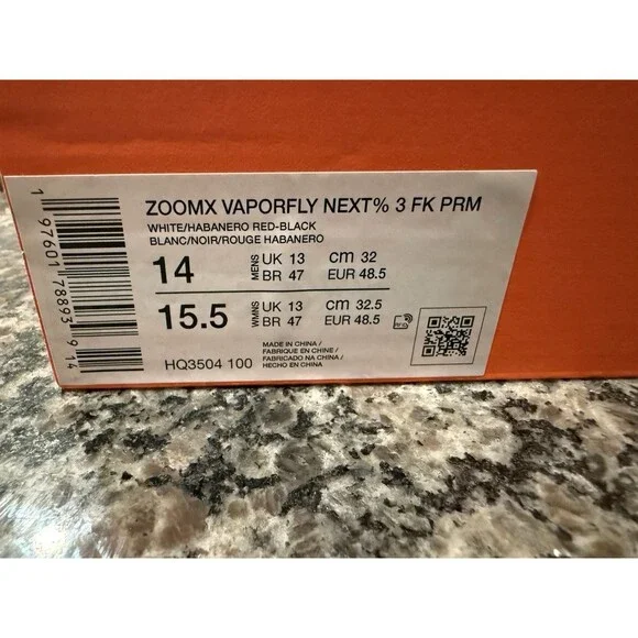 100% Authentic Guaranteed.Item DescriptionItem for Sale: Size 14 Nike ZoomX Vaporfly Next% 3 FK PRM White Habanero MensColorway: MulticolorStyle Number: HQ3504-100Year of Release: 2024Condition: Brand New With Box NO LIDSize: 14Shipping: All shoes are shipped through USPS Priority Mail, FedEx, or UPS. We ship Monday-Sunday 7 days a week within 2 days of receiving payment. We must ship to the address that you provide to eBay/PayPal at checkout. Please make any corrections to your address prior to payment. Address corrections will not be made under any circumstances.*Please be aware that not every pair of sneakers from Nike is in perfect condition. Therefore, to pass authentication under eBay, the buyer assumes all responsibility if there are factory flaws, defects, or imperfections when it comes to the shoes. The buyer also assumes all responsibility if there is damage to the shoe box or box lid. We are not responsible for any Nike imperfections or damage to the shoe and/or shoe box.About Us: We are a 100% positive feedback seller and believe customer service is very important. We guarantee that every pair of sneakers sold from us is 100% brand new with the original packaging. Please contact us with any problems or questions and we will help resolve them ASAP!Thank you for shopping with us!