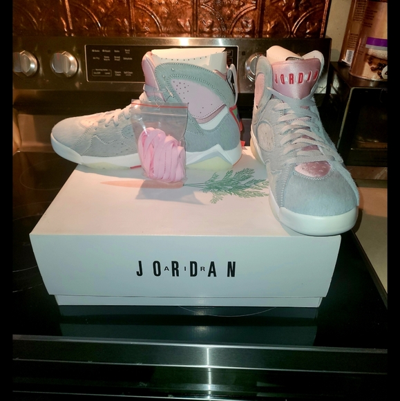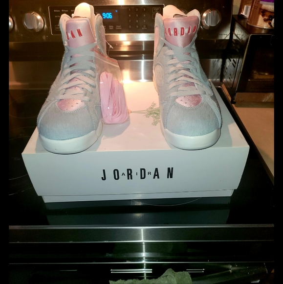 Stylish Air Jordan sneakers in gray and pink. Perfect for casual wear.