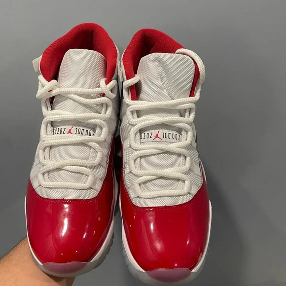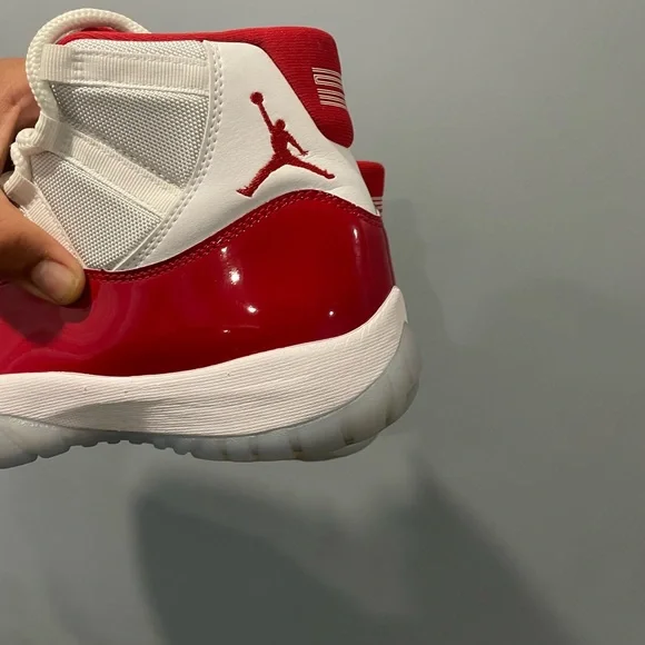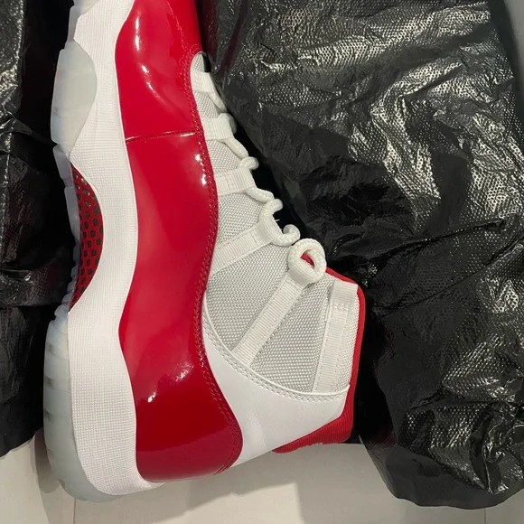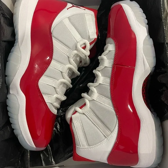 These Jordan sneakers feature a bold red and white colorway, highlighted by a glossy patent leather overlay. The high-top design offers both style and comfort, while the clean white upper contrasts beautifully with the vibrant red accents, making them a standout choice for any sneaker enthusiast.