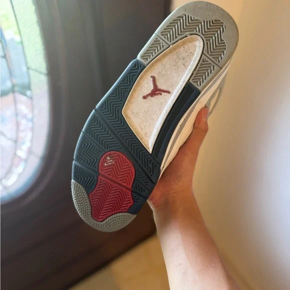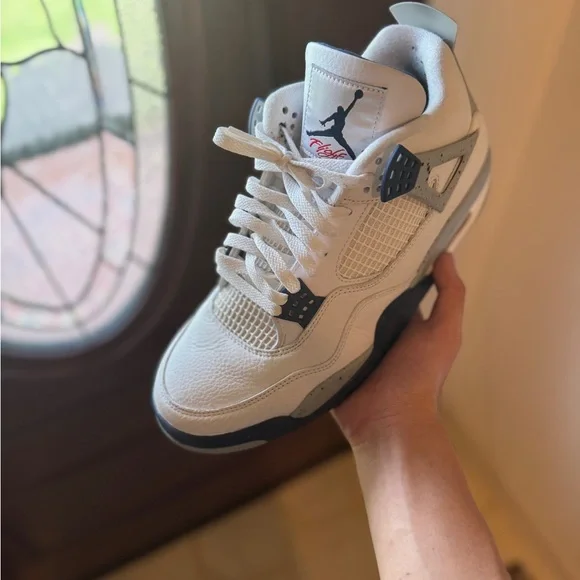 Stylish Air Jordan 4 Retro sneakers in white and gray. Perfect for casual wear.