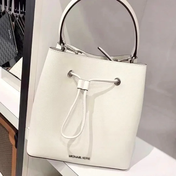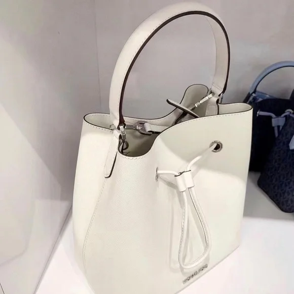 Michael Kors Suri Large Bucket Crossbody In White Color100% Authentic Bag Details: Material: LeatherSilver hardware does have a pen mark in the bottom 10”L X 10.5”H X 6”WInterior details: back slip pocketOFFERS WELCOMEPlease check out my additional bags by MK, Coach, Kate spade and CD. Along with clothes from Express, The Limited, Michael Kors and Macys.