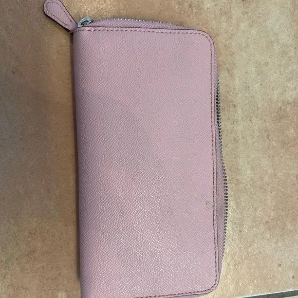 Elegant Coach wallet in soft pink. Features a sleek design with a front pocket and zip closure.