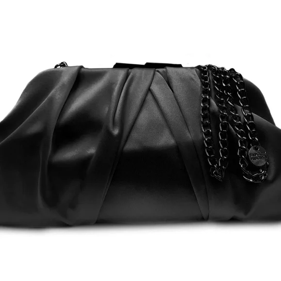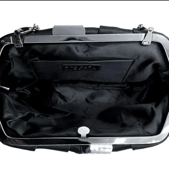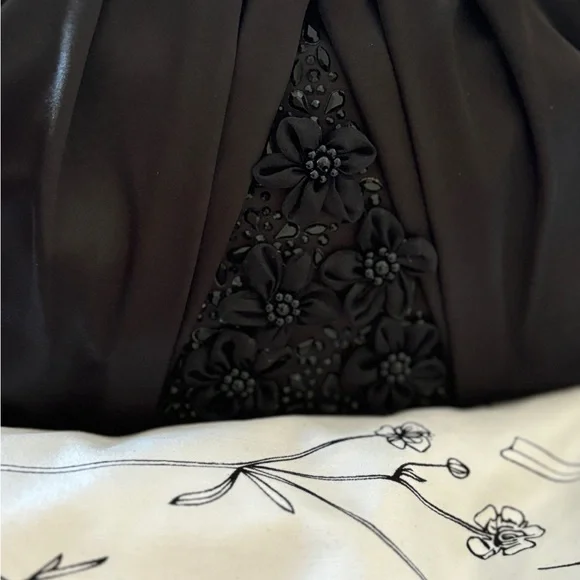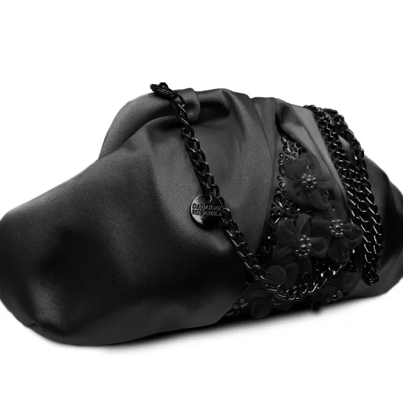 Add a touch of elegance to your outfit with this stunning Badgley Mischka clutch purse. The beautiful floral detail on the satin exterior material adds a romantic touch to the black color. The clutch is perfect for any occasion, especially weddings, and the small size makes it easy to carry. The black handle/strap color and lining color give it a sleek and sophisticated look. The brand is known for their high-quality fashion and this clutch is no exception. Make a statement with this gorgeous accessory.